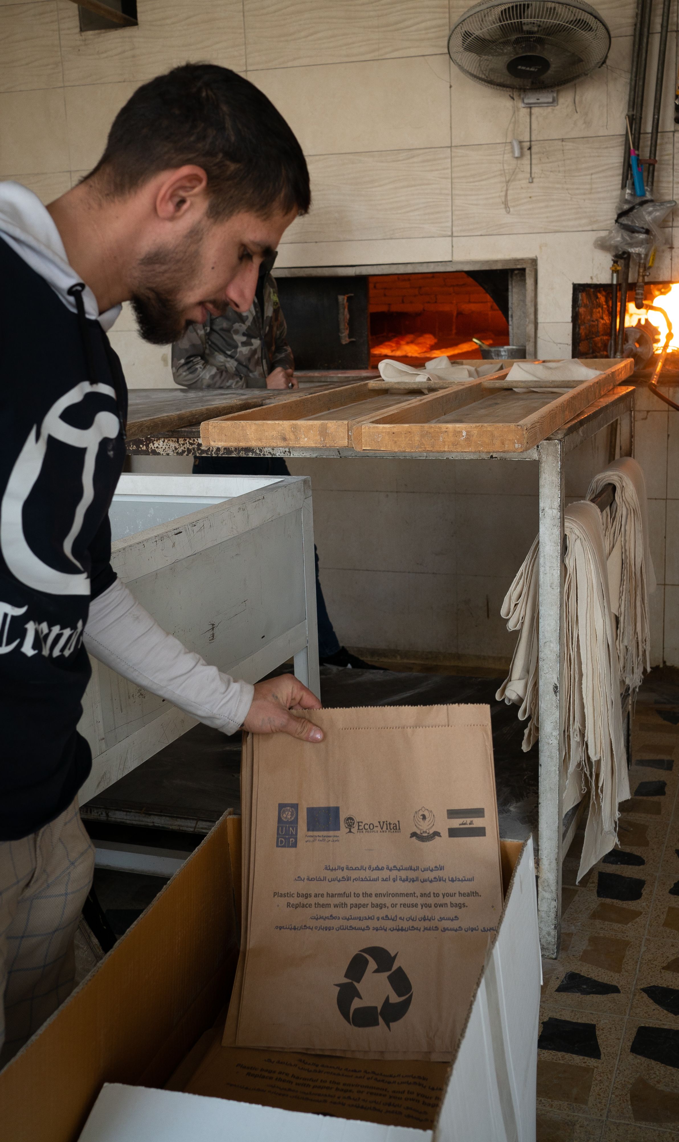 UNDP Iraq introduced Eco-Vital, with financial support from the European Union, to distribute paper bags to bakeries in Erbil to present this alternative to bakers and consumers and raise people's awareness of good environmental practices. Eco-Vital and its partners, who produce paper bags, have contacted bakeries in Erbil to learn more about the reasons for choosing plastic, even though people in Kurdistan traditionally buy their bread in cloth or paper bags.
