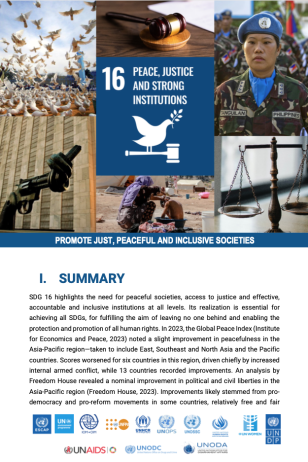 SDG 16 highlights the need for peaceful societies, access to justice and effective, accountable and inclusive institutions at all levels. Its realization is essential for achieving all SDGs, fulfilling the aim of leaving no one behind and enabling the protection and promotion of all human rights. Since 2015, one-third of the targets globally showed 'fair' progress, while one-quarter 'stagnated or regressed'. Overall progress on SDG 16 in Asia-Pacific remains alarmingly slow, and not the most significant or impactful. Globally, more than 40 per cent of the targets lack sufficient follow-up data. SDG 16 data remain particularly limited in the Asia-Pacific region, with 58 countries and territories lacking data on six indicators.