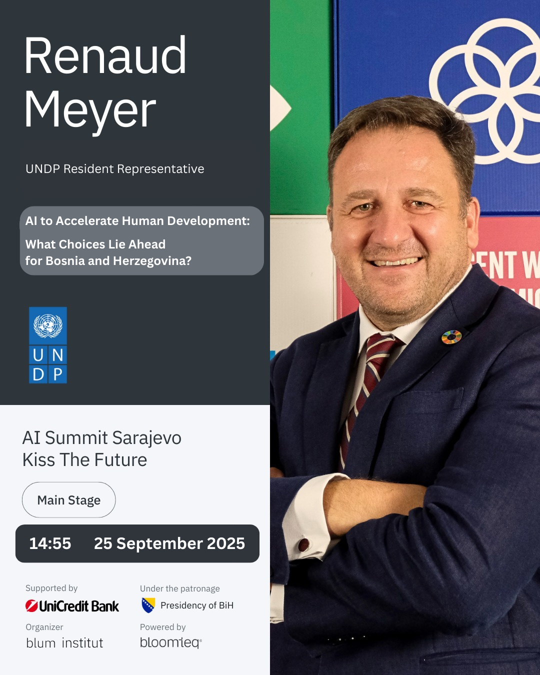 Na predstojećem „Kiss the Future“ AI Summitu, koji počinje 25. septembra u Sarajevu, rezidentni predstavnik Razvojnog programa Ujedinjenih nacija (UNDP) u Bosni i Hercegovini Renaud Meyer održaće predavanje pod naslovom „AI za ubrzanje ljudskog razvoja: Koji su izbori pred Bosnom i Hercegovinom?“