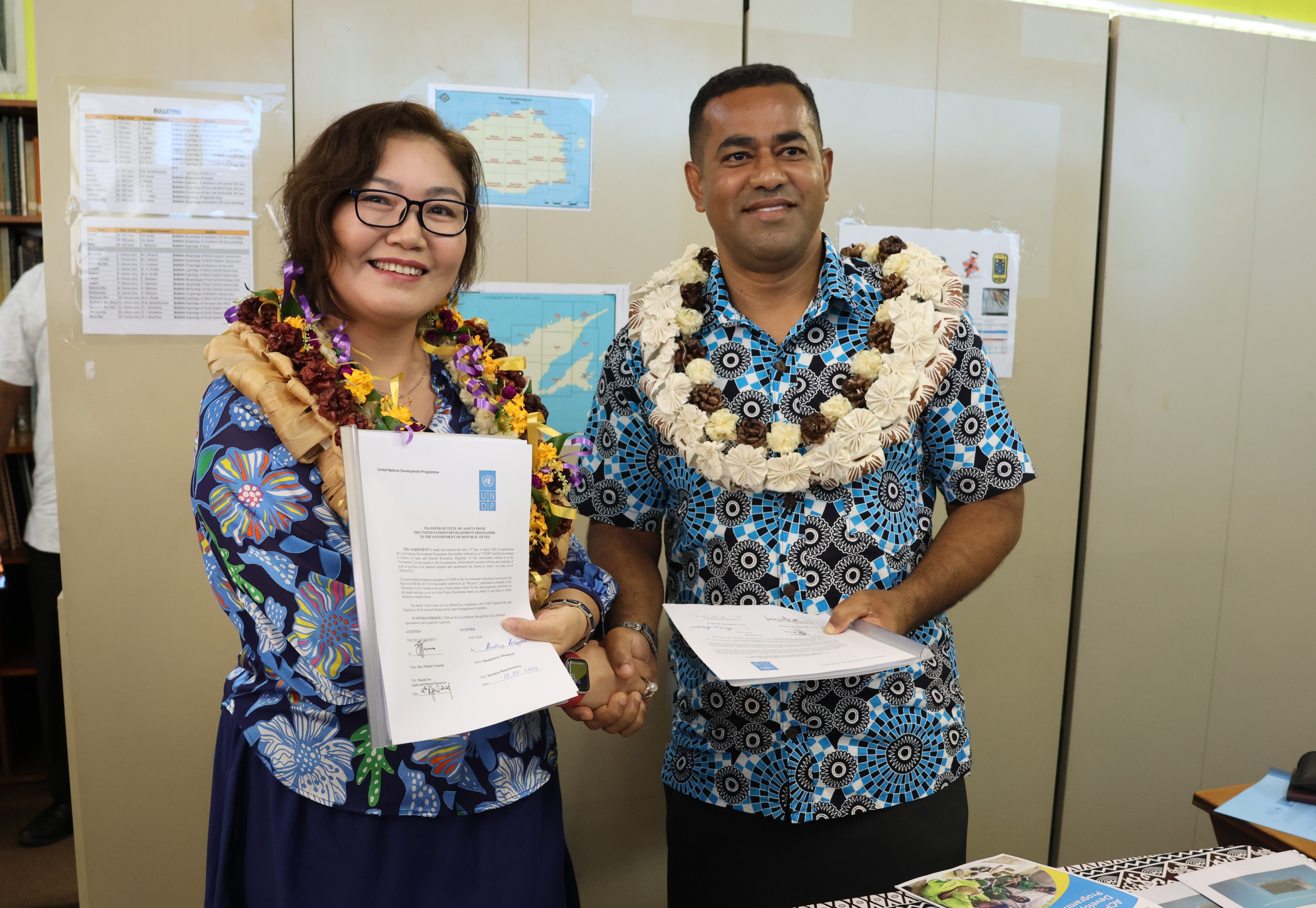 Resident Representative for the UNDP Pacific Office in Fiji, Ms Munkhtuya Altangerel and Fiji's Minister for Lands and Mineral Resources, Hon. Filimoni Vosarogo after signing the asset transfer documents for the Book-Eye 5 high end scanner.