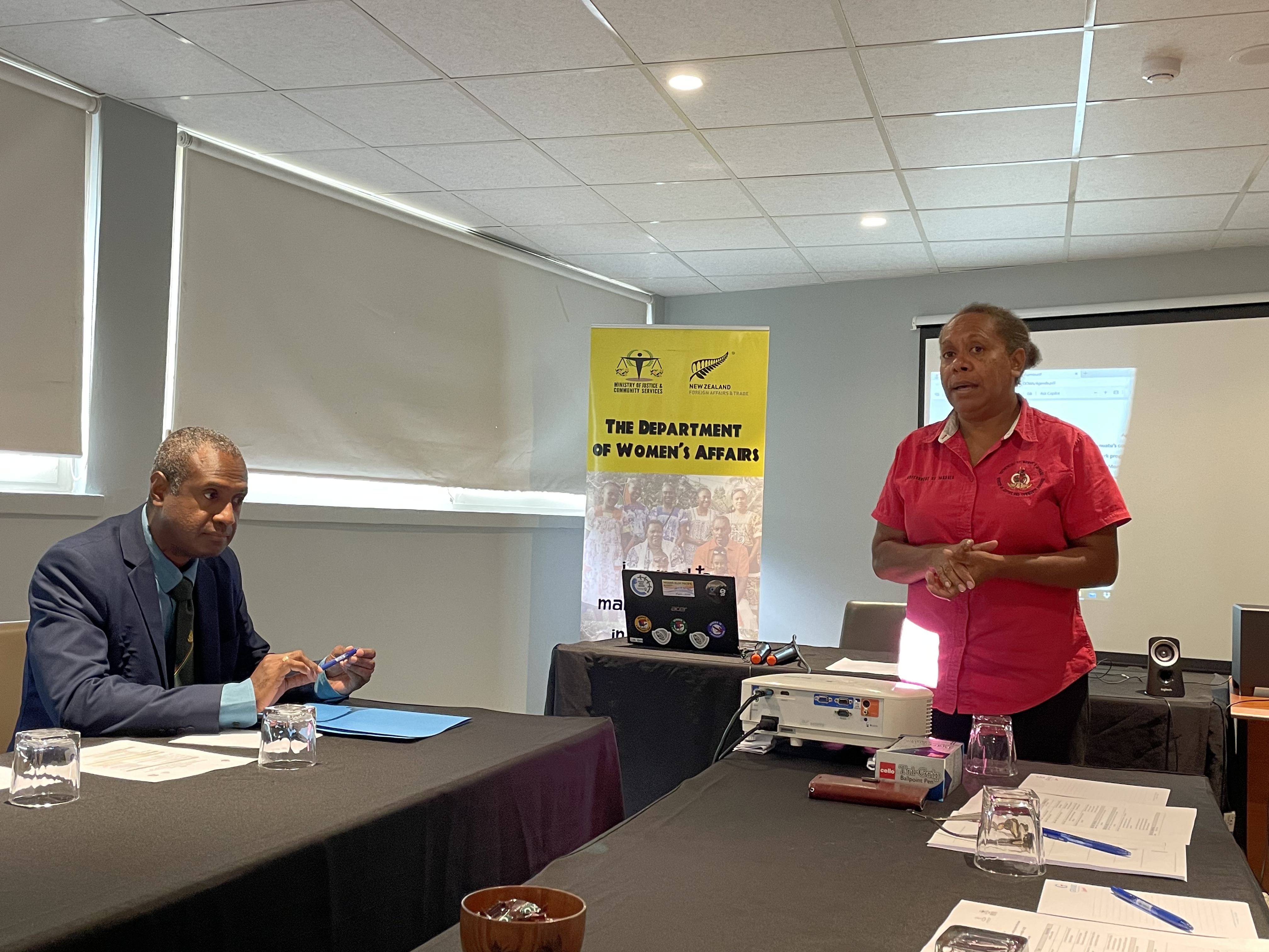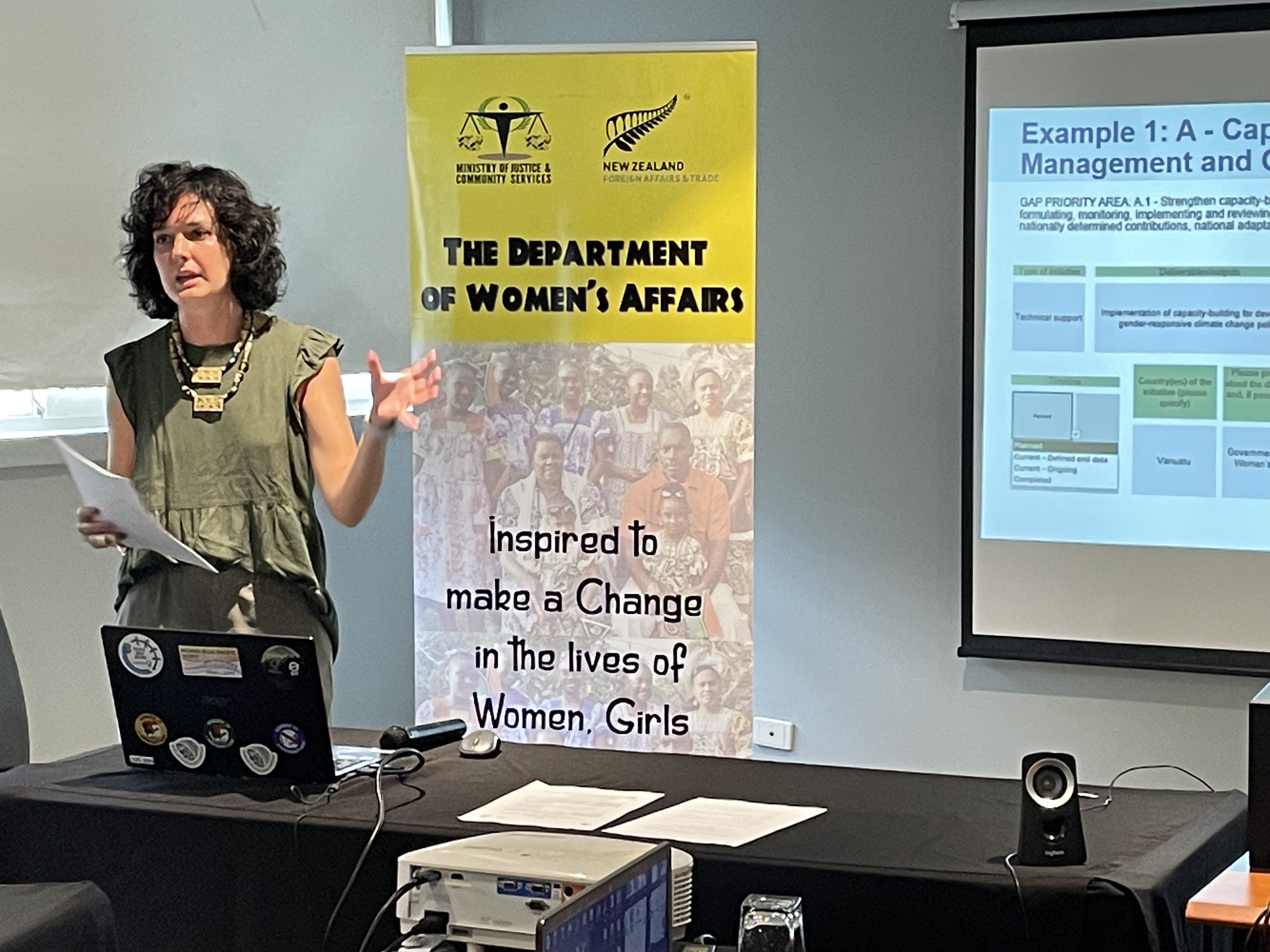 Director Rothina Noka from Department of Women’s Affairs, explaining how Global Commitments on Climate Change and DRR are connected to Regional and National laws and policies.