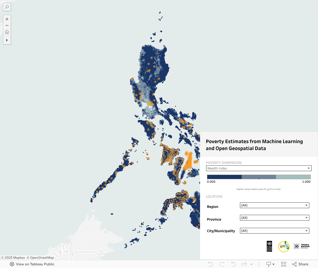 On human development: as the country seeks to further reduce poverty to a single-digit rate by 2028, pockets of poverty need to be identified and reached more precisely. The granular poverty estimates could help fine-tune targeting towards geographically isolated and disadvantaged areas. This way, inequality within localities can be addressed. Here is a potential prototype for how this could look like: UNDP and Thinking Machines previously collaborated with the Zero Extreme Poverty 2030 Philippines coalition to map the latter’s on-the-ground presence against the granular poverty estimates. This, among other intelligence gathered, helped the ZEP2030-UNDP collaboration to pinpoint where and how to expand ZEP’s network of local convergences.