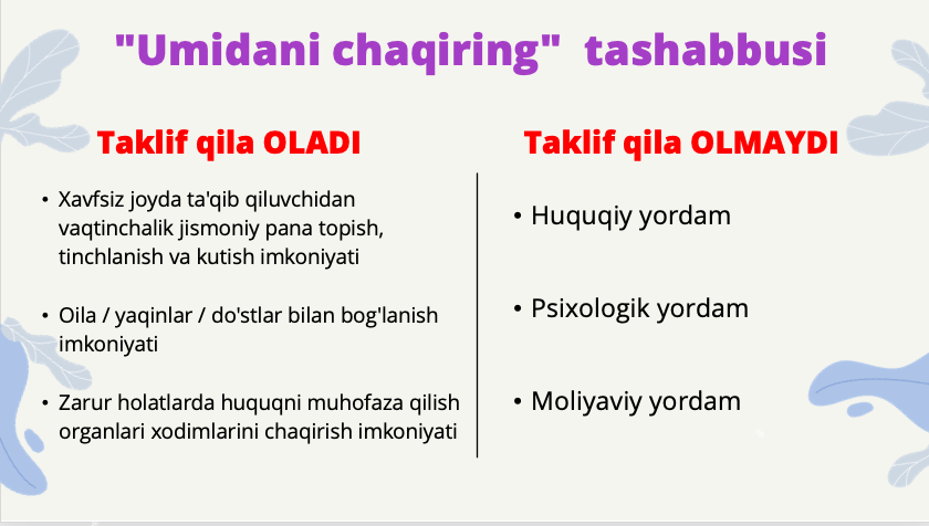 - “Umidani chaqiring” tashabbusi jamiyatdagi gender sohasidagi zo‘ravonlik bilan bog’liq boshqa dolzarb muammolar va ularni bartaraf etishning ahamiyatini belgilab berdi va o’rtaga qo’ydi.